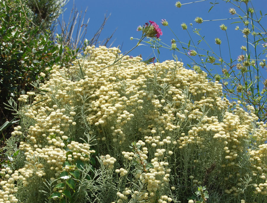 Photo à droite: santolina ligustica, une espèce autochtone – dont il n'existe que 30.000 exemplaires -  qui croît seulement sur les roches vertes volcaniques de la côte entre Punta Mesco et Deiva Marina.