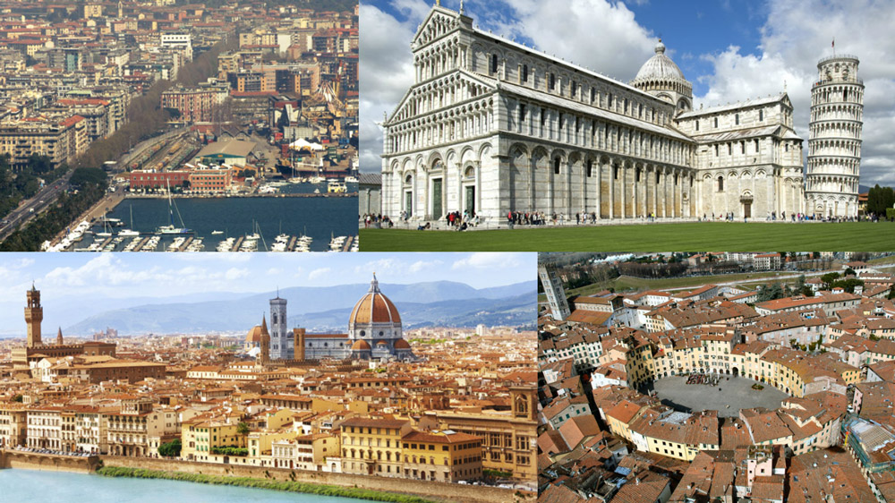 • Lucca, km 90: la Vieille Ville, située sur les corniches des Apennins, a beaucoup de monuments historiques. Elle est ceinte pour 4 km de remparts parfaitement conservés. Le plan urbanistique est l'un des meilleurs exemples d'architecture de la Renaissance.